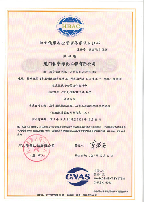 職業(yè)健康安全管理體系認(rèn)證證書